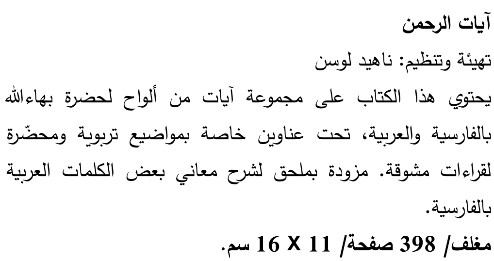 Recueil de versets tirés des Tablettes de Bahá'u'lláh en persan et en arabe, classés sous des titres choisis et organisés pour une lecture quotidienne agréable. Accompagné d'un glossaire de définitions en arabe et en persan.