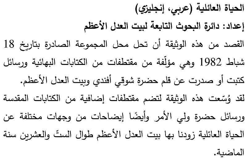 Ce titre comprend des extraits des Écrits bahá'ís et des lettres écrites par et au nom de Shoghi Effendi et de la Maison universelle de justice. Il a été enrichi d'extraits supplémentaires des Écrits sacrés et des lettres du Gardien, ainsi que d'explications sur divers aspects de la vie familiale bahá'íe fournies par la Maison universelle de justice au cours des 26 dernières années.