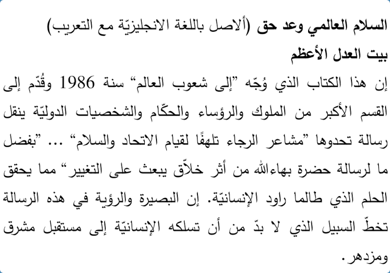 Adressé « Aux peuples du monde » en 1986 et présenté à presque tous les rois, présidents, dirigeants et dignitaires du monde, ce message d'espoir témoigne de la conviction que la réalisation imminente du rêve séculaire de paix est désormais à la portée de l'humanité grâce aux effets transformateurs de la révélation de Bahá'u'lláh. Les idées et les visions exprimées dans ce message tracent la voie inévitable qui mène à un avenir plus radieux et plus prospère.