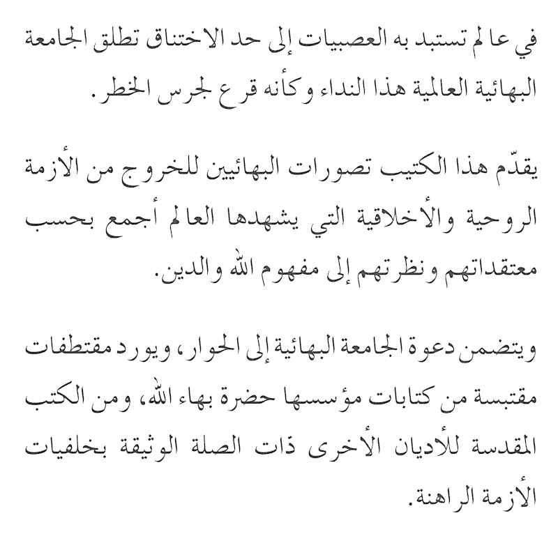 La réponse à la lettre que 'la Maison universelle de justice' fit parvenir, à Ridván 2002, à tous les chefs religieux du monde, fut dans l'ensemble encourageante. C'est maintenant au tour des bahá'ís de prendre conscience de leurs responsabilités et de leur rôle dans l'éradication du fanatisme religieux. 'Une seule et même foi' développe les attitudes à adopter, les concepts à intégrer et les moyens à mettre en œuvre car "... la faillite de plus en plus rapide de l'ordre social requiert désespérément que l'esprit religieux se libère des entraves qui l'ont empêché jusqu'à présent de répandre l'influence salvatrice dont il est capable." Après avoir introduit ce texte, la Maison universelle de justice termine ainsi : "Nous le recommandons à l'étude attentifs des amis."